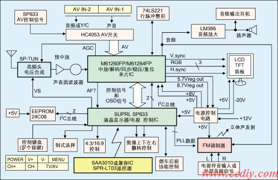 SP633是专为小尺寸车载或便携式液晶显示器/电视开发的多功能MCU控制芯片(已做了掩膜)。基于SP633的小尺寸液晶电视设计方框图如图1所示,主芯片为MCU SP633以及单芯片电视解码器M61260FP/M61266FP。